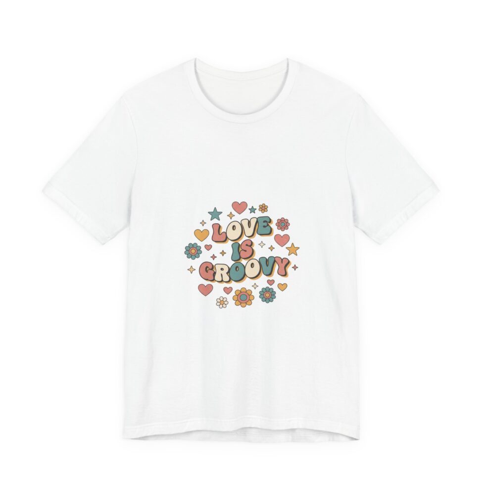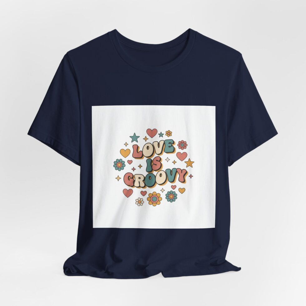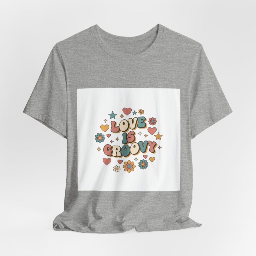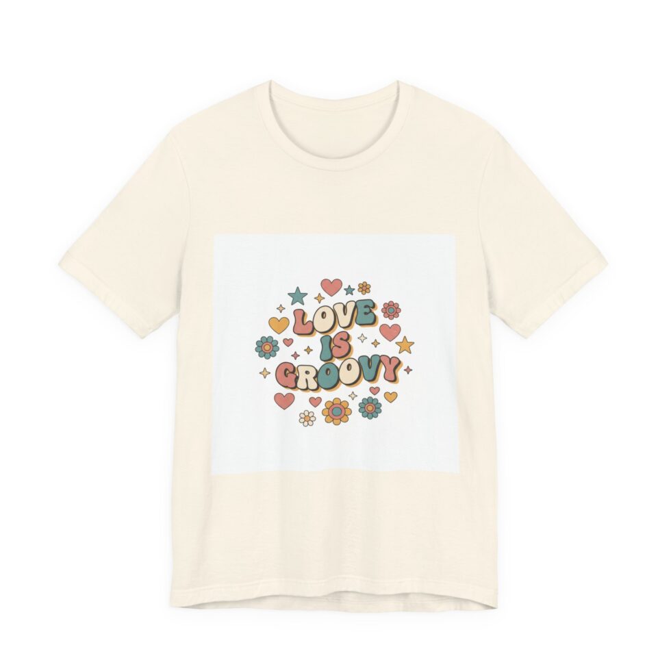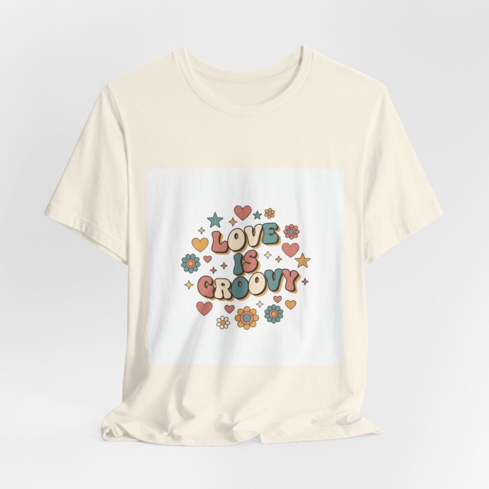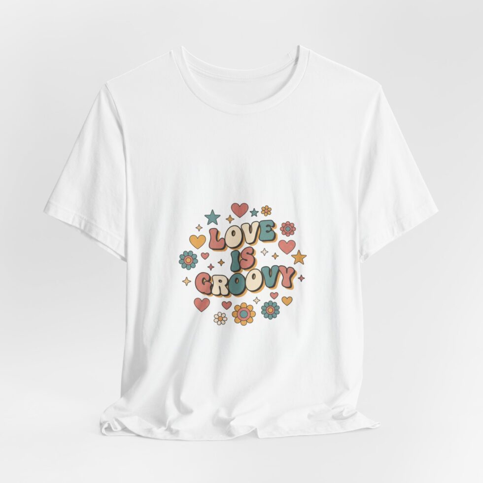 Warm, retro-inspired tee featuring a bubbly 70s-style wordmark and playful floral and heart motifs in a dusty-rose, mustard, teal, and cream palette. The centered artwork reads as a compact, nostalgic badge — rounded letterforms and groovy layouts that read clearly in thumbnails and layer well with vintage wardrobes. It channels the Retro Valentine Typography trend for shoppers seeking cozy, nostalgic romance graphics with a collectible, everyday-wear vibe.