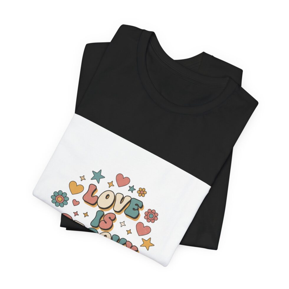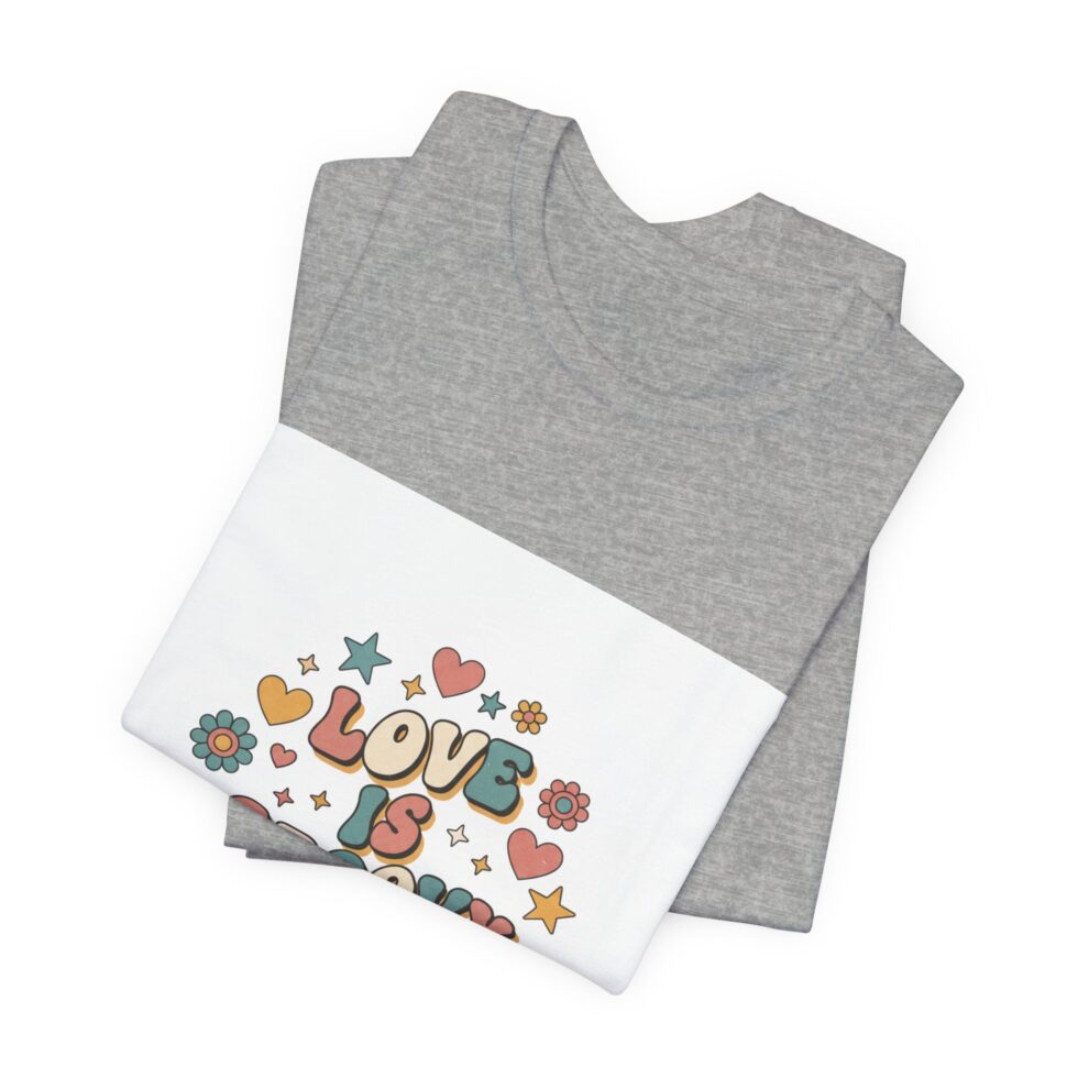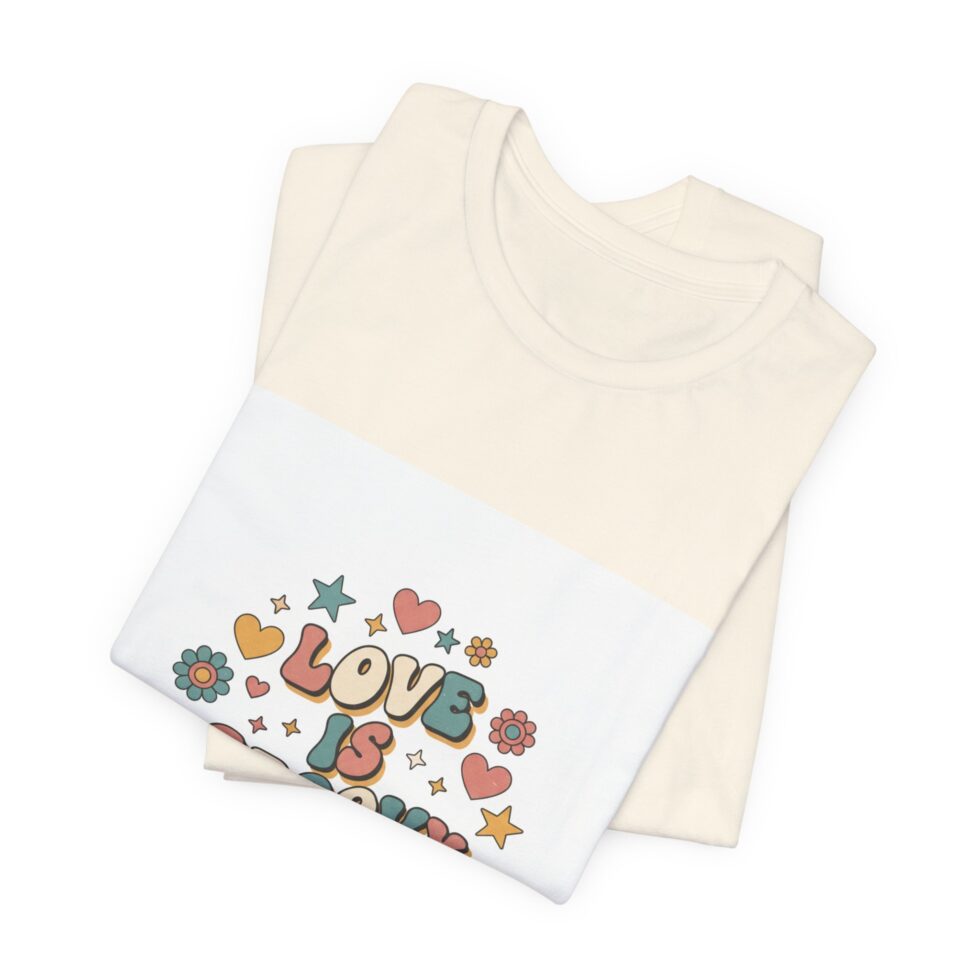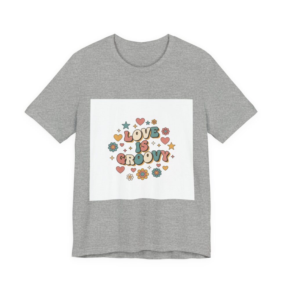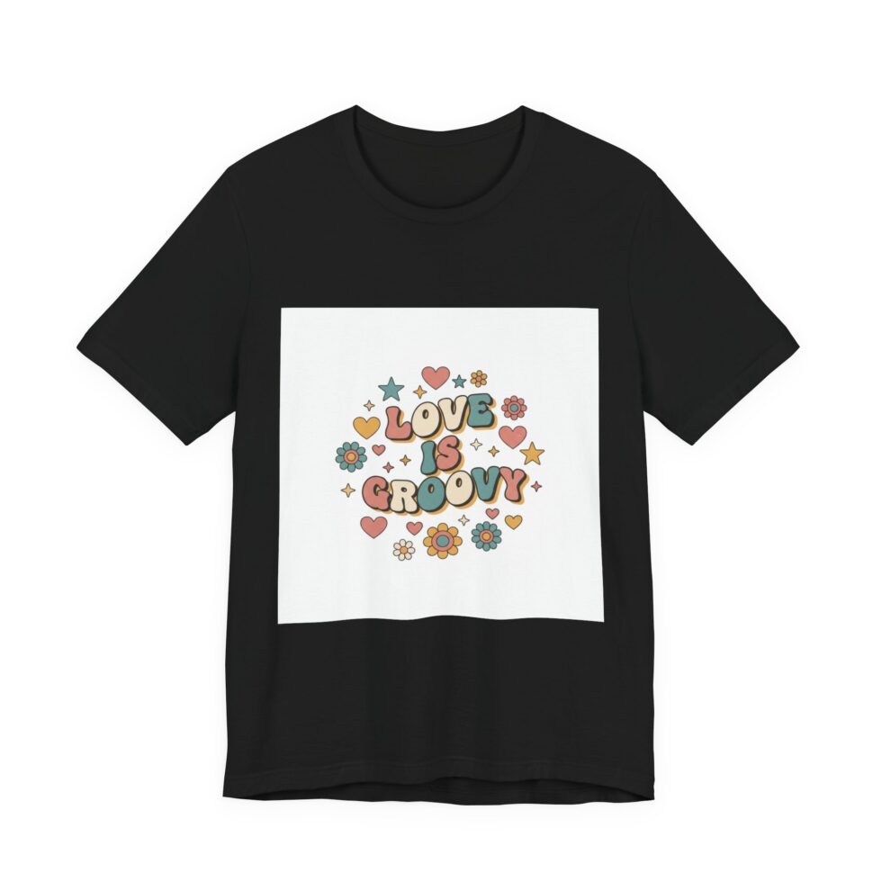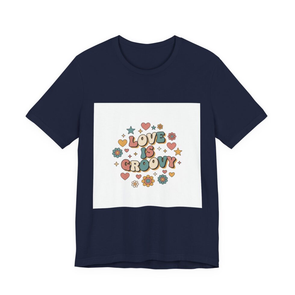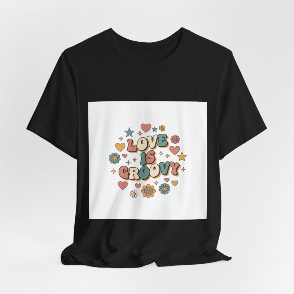Warm, retro-inspired tee featuring a bubbly 70s-style wordmark and playful floral and heart motifs in a dusty-rose, mustard, teal, and cream palette. The centered artwork reads as a compact, nostalgic badge — rounded letterforms and groovy layouts that read clearly in thumbnails and layer well with vintage wardrobes. It channels the Retro Valentine Typography trend for shoppers seeking cozy, nostalgic romance graphics with a collectible, everyday-wear vibe.