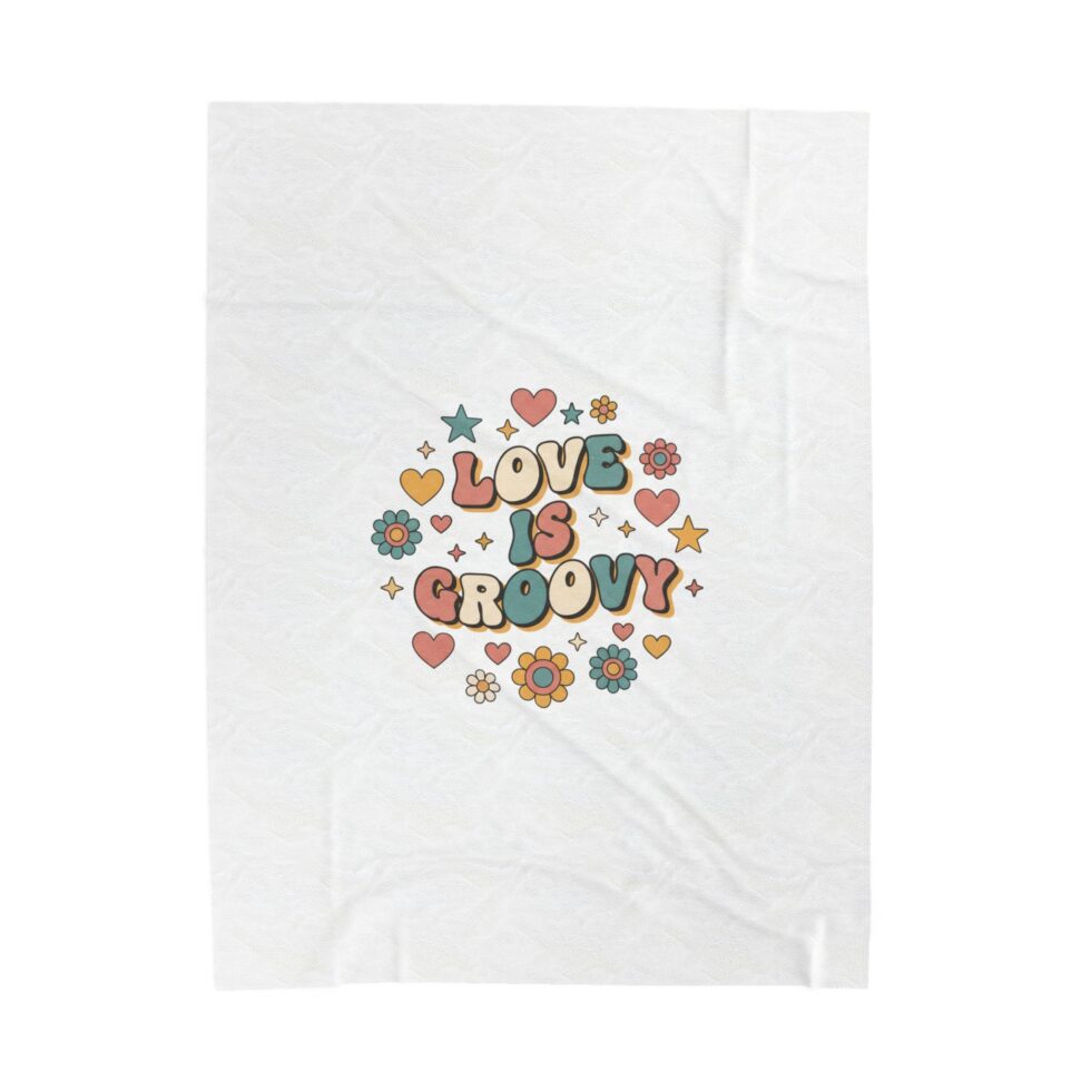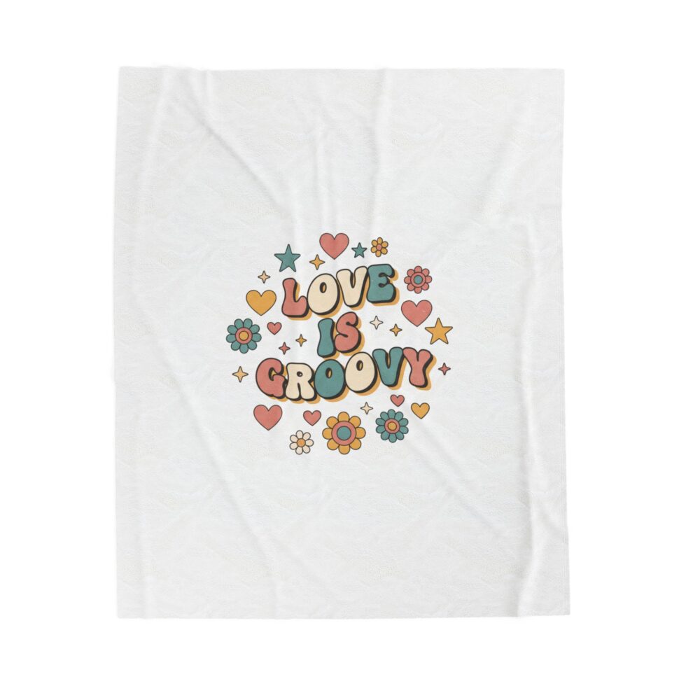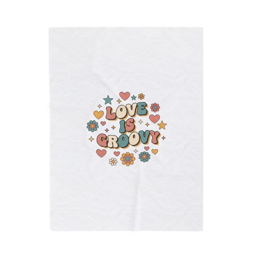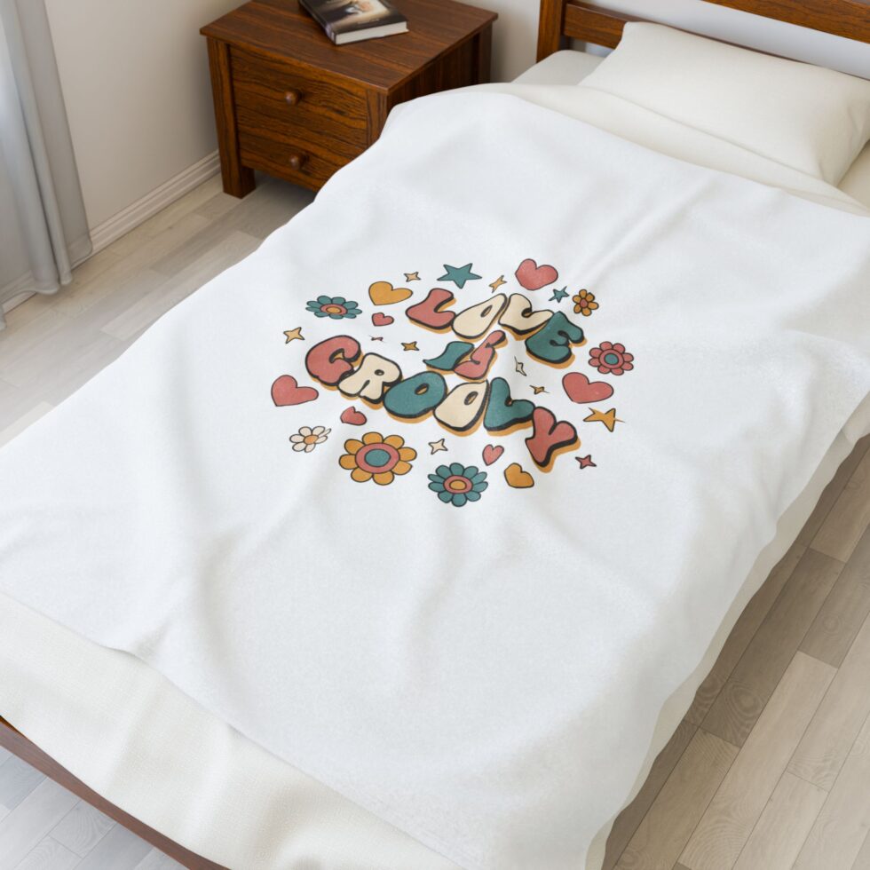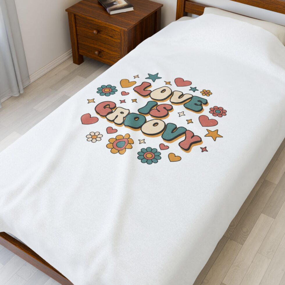 Soft, retro-inspired plush blanket featuring warm, groovy typography and playful 70s motifs. The centered artwork uses rounded, bubble letterforms and a dusty rose/mustard/teal palette surrounded by hearts and flowers for a nostalgic Valentine vibe that reads clearly in thumbnails. Lightweight but medium-heavy plush makes it a cozy decor layer for couches, reading nooks, or seasonal displays, aligning with retro Valentine and nostalgia-romance searches.