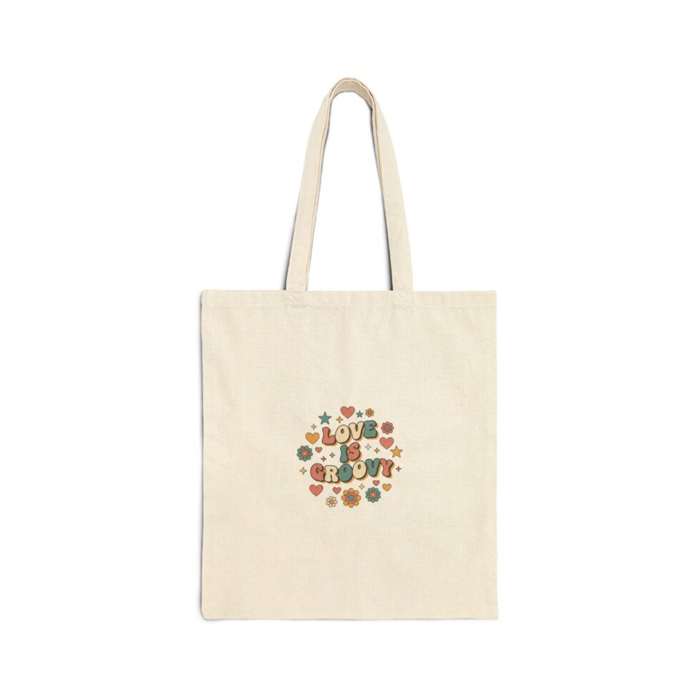 Dusty-rose and mustard bubble lettering forms a compact, groovy ‘love’ motif surrounded by small hearts and floral dots — a soft, retro-Valentine look that reads clearly at thumbnail scale. The design leans into 1970s–90s nostalgia with rounded type and muted palette, giving everyday tote use a cozy, vintage charm for shoppers following retro Valentine and 70s love trends. Lightweight enough for daily errands yet visually aligned with collectible, nostalgia-focused wardrobes and decor.