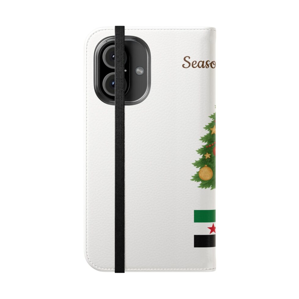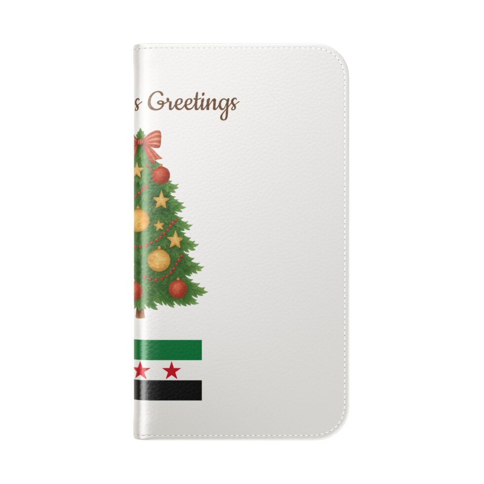 Carry a little holiday spirit and a touch of home wherever you go. This flip phone case folds into a neat wallet and stand, with stitched card pockets and a durable polycarbonate inner shell to keep your device safe. The front shows a festively decorated tree above a trio of colored bars and three red stars — a subtle, heartfelt nod to identity and remembrance during the season. Soft-feeling vegan leather and a flat elastic closure give everyday comfort, while a D-ring option (for S24/S25 models) lets you add a wrist or neck strap for hands-free travel or quick access on the move. A slip with care instructions is included and the case is made in South Korea.