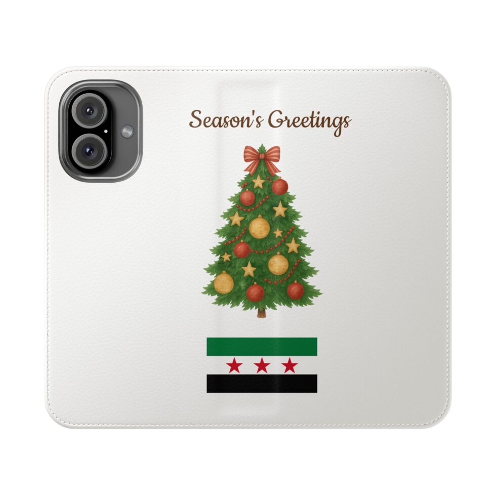 Carry a little holiday spirit and a touch of home wherever you go. This flip phone case folds into a neat wallet and stand, with stitched card pockets and a durable polycarbonate inner shell to keep your device safe. The front shows a festively decorated tree above a trio of colored bars and three red stars — a subtle, heartfelt nod to identity and remembrance during the season. Soft-feeling vegan leather and a flat elastic closure give everyday comfort, while a D-ring option (for S24/S25 models) lets you add a wrist or neck strap for hands-free travel or quick access on the move. A slip with care instructions is included and the case is made in South Korea.
