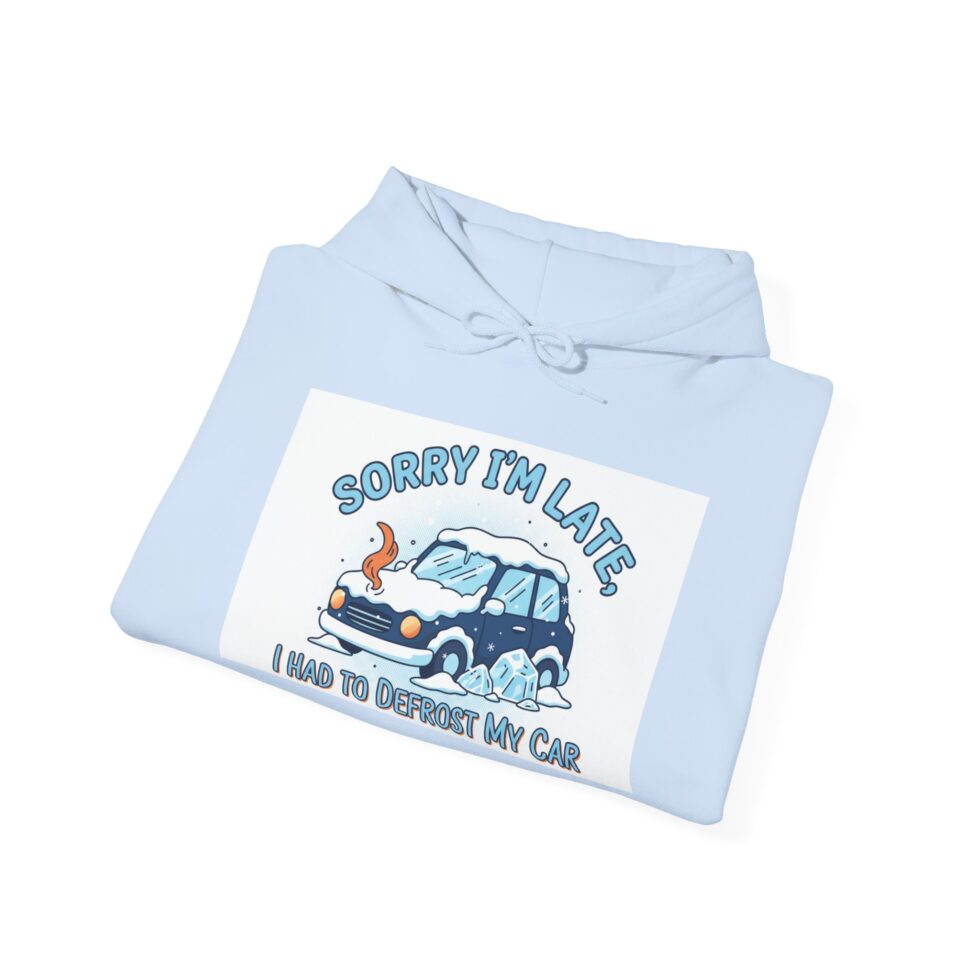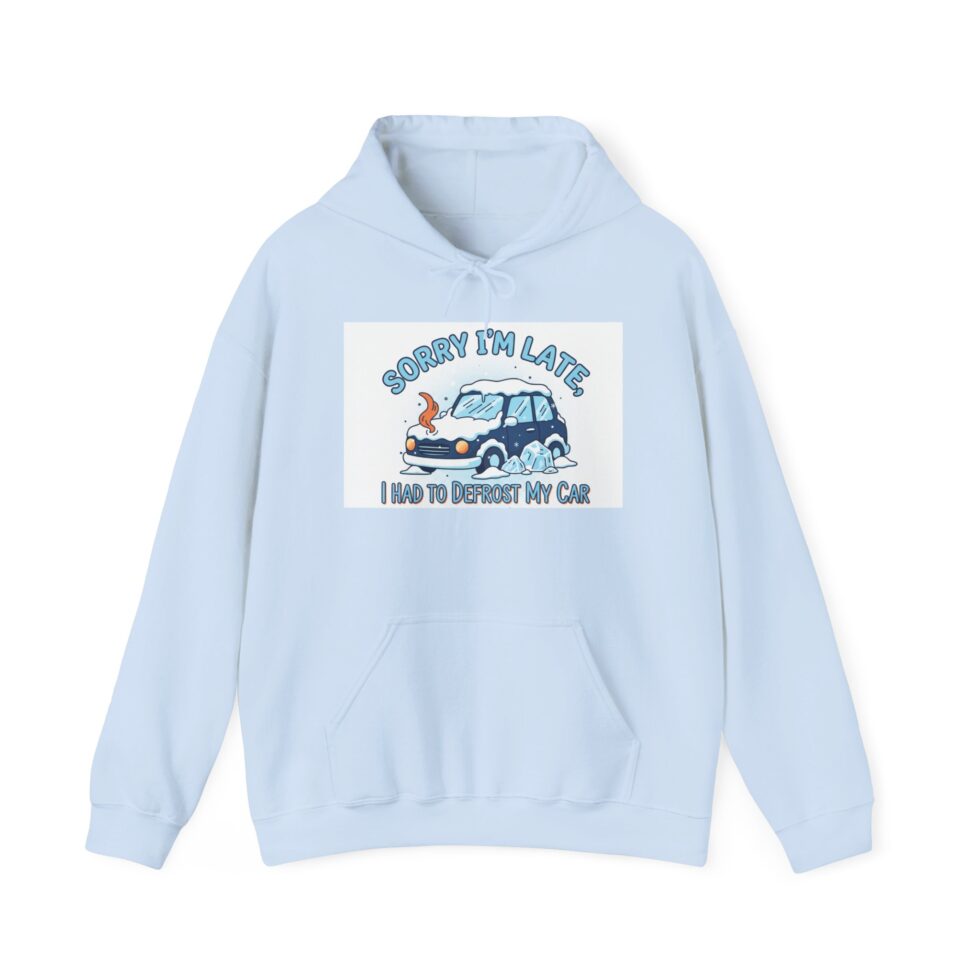 Light blue, cozy, and a little bit cheeky — this hooded sweatshirt carries a hand-drawn vibe that makes mornings feel softer. A worn little car with a flustered driver sits beneath the playful headline “Sorry I’m Late,” and the smaller line reads “I had to de-bug my car.” The illustration and rounded lettering have a nostalgic, sketchbook quality that pairs with the sweatshirt’s plush, slightly heavyweight knit. Layers into chilly commutes, weekend coffee runs, late-night coding sessions, or car-mechanic-prank hangouts. It’s the kind of slow-brew humor you reach for when you want comfort and a smile in one piece.